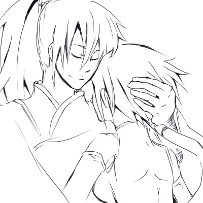 河川敷で体育座りのプラ太さんの背中にまるで毛皮のようにもたれかかるまやちゃんの図が。